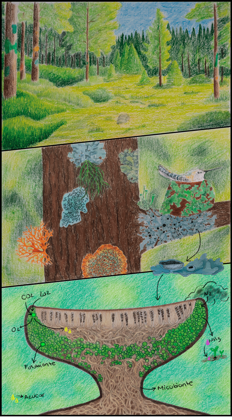 Esta ilustración explora el papel ecológico de los líquenes en ecosistemas tropicales y su estructura simbiótica. Formados por la asociación entre un hongo (micobionte) y un fotobionte (alga verde o cianobacteria), los líquenes realizan fotosíntesis, fijan nitrógeno atmosférico y resisten condiciones extremas, siendo fundamentales en la dinámica del ecosistema. La composición se organiza en tres escalas: